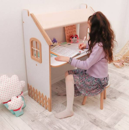 Detský písací stôl je kus nábytku, ktorý v sebe spája dve funkcie: slúži ako pracovný stôl a môže slúžiť ako drevený obchod/bazár na hranie.